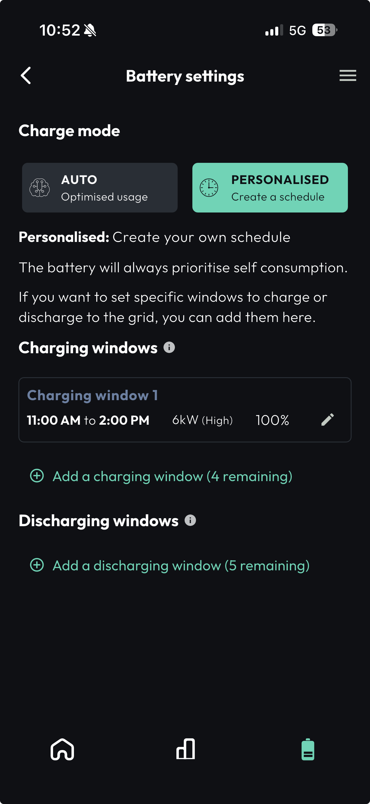 The personalised mode is useful if you know you have specific periods either in your retail energy plan, or in the way you consume your energy, that are advantageous for charging or discharging your battery.