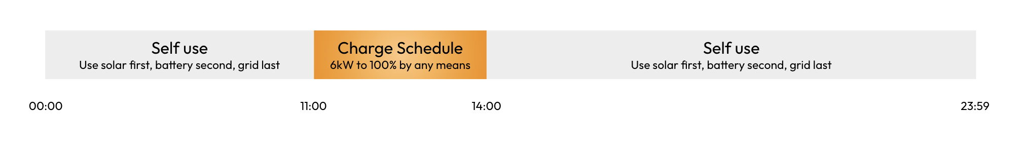 Then from 11am to 2pm it will take a charge of ~6kW until either the window closes, or the target SoC of 100% is met. If the window closes before the target is met, the system will stop charging at ~6kW. If there's excess solar being generated to meet this demand during the window, then great, it'll use all the solar. If not, then the inverter will draw the rest from the grid, for either the whole period or until you meet 100% SoC.