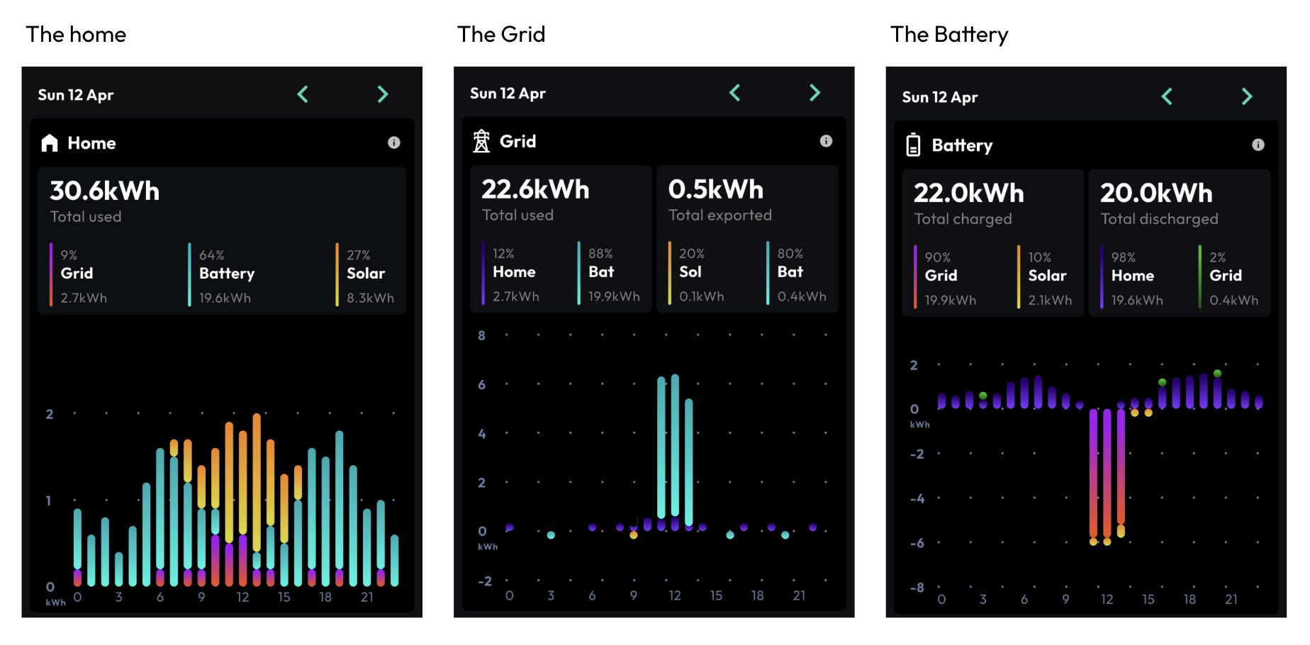 If we take a look at how this might show up in the graphs in your app, you'll see a large amount of demand from the grid in the 11-2pm window (blue in the grid graph, purple /red in the battery graph), but then the majority of home consumption outside of these periods is covered by the battery and solar (blue and orange in the left home graph).